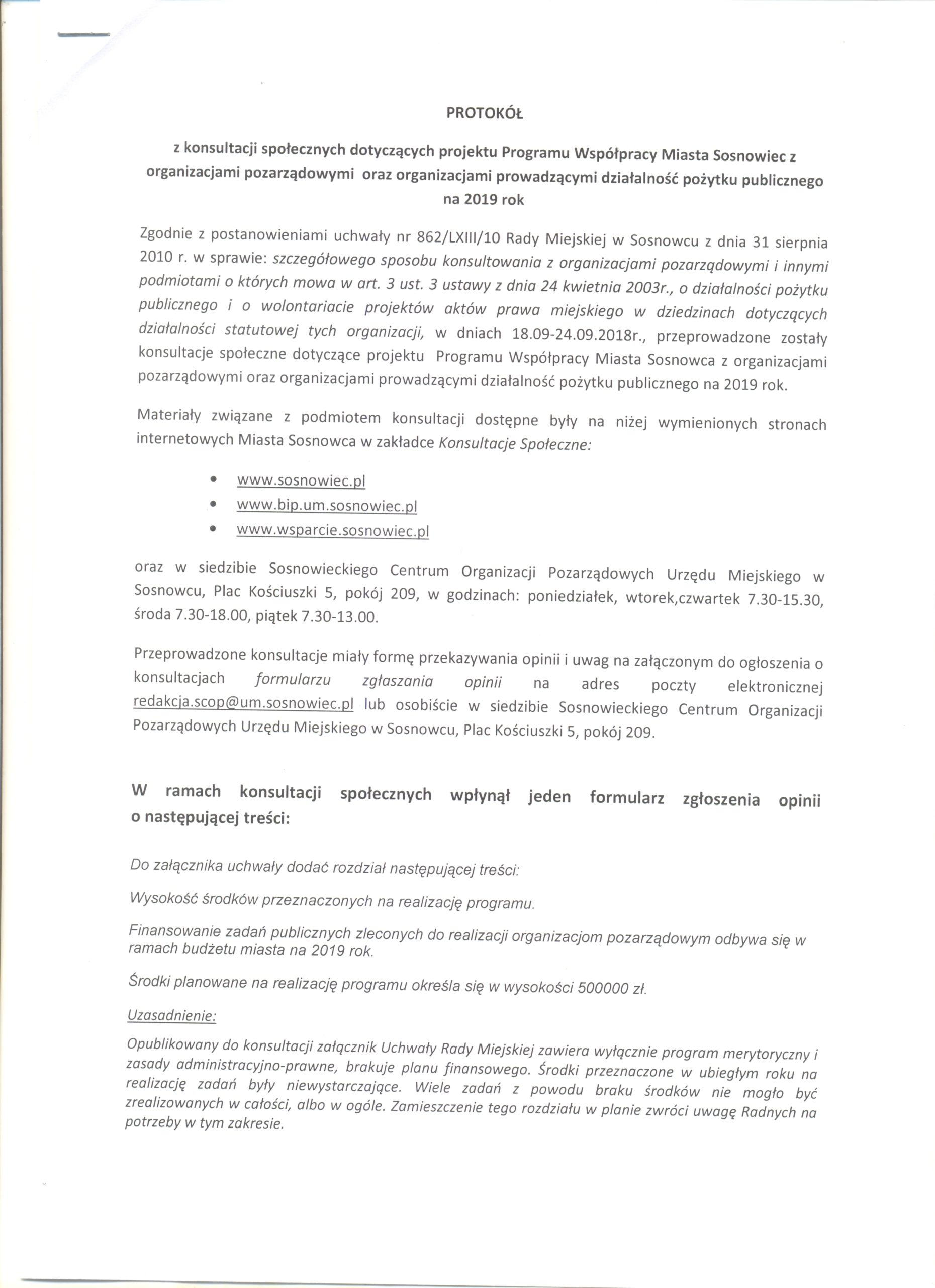 - Protokół z konsultacji społecznych dotyczących projektu Programu Współpracy na rok 2019 cz.1
